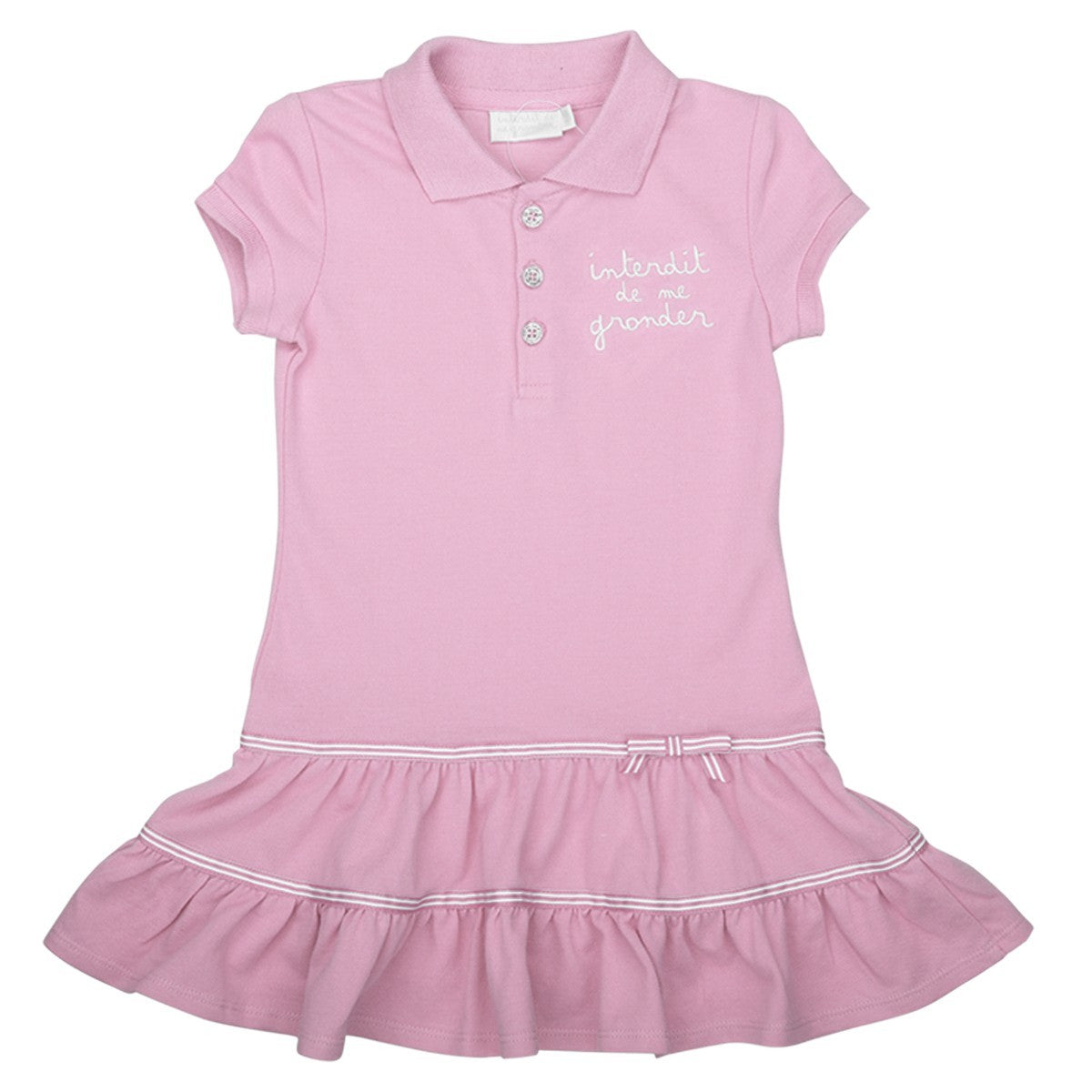 Fald for den elegante "Mademoiselle" polokjole fra mærket Interdit de me gronder . Den er i en smuk , blød pink farve med en klassisk polokrave og korte ærmer. En fin hvid broderet besked foran tilføjer et karakteristisk touch. Taljen fremhæves af et tyndt , hvidstribet bælte og en lille sløjfe , mens kjolens bund har charmerende hvidstribede flæser . Komfortabel og stilfuld kjole, der er perfekt til et look, der er både elegant og afslappet.